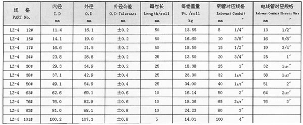 | 規(guī)格PART No. | 內(nèi)徑I.D mm | 外徑O.D mm | 外徑公差 mm | 每卷長 mm | 每卷重量 kg | 鋼管對應規(guī)格 mm | 電線管對應規(guī)格 mm |