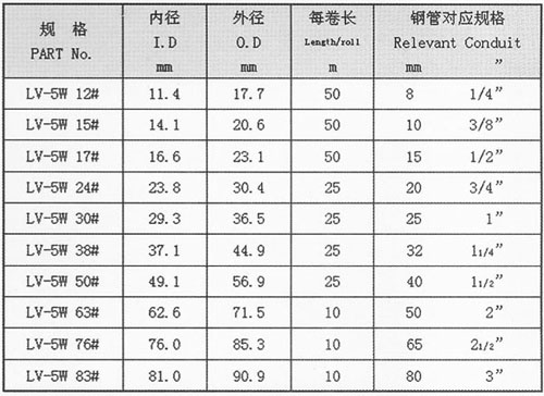 規(guī)格 PART No. | 內(nèi)徑 I.D mm | 外徑 O.D mm | 每卷長 Length/roll m | 鋼管對應規(guī)格 Relevant Conduit mm ‘’ |